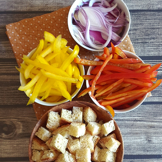 Per cominciare preparare tutti gli ingredienti. Procedere tagliando le fette di pane a cubetti e i cipollotti a fette sottili con l'aiuto di una mandolina.