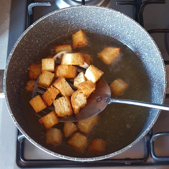 A questo punto friggere i cubetti di pane nell'Olio di semi Frìmax Sagra caldo per pochi istanti fino a doratura. Quindi scolare su carta assorbente.