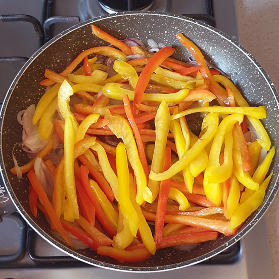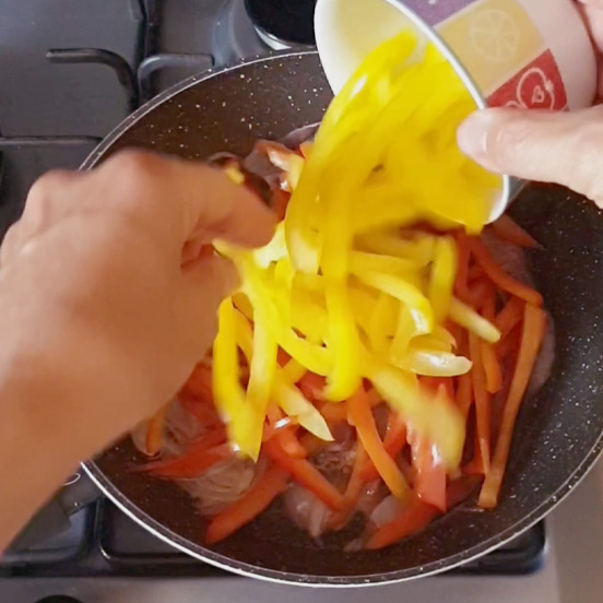 Poi mescolare le tagliatelle di peperoni e far cuocere per 3 o 4 minuti, fino a renderle morbide ma croccanti. Se necessario regolare di sale.