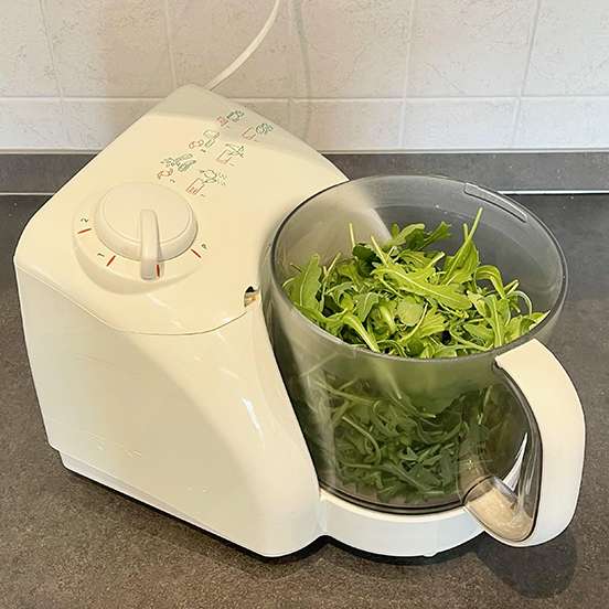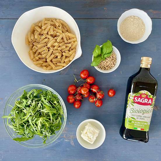 Preparare il pesto tritando nel mixer la rucola. Aggiungere 3 cucchiai di olio e i pinoli e mixare. Aggiungere il parmigiano e la robiola e continuare a tritare.