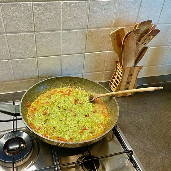 Far rosolare l’aglio e l’olio, aggiungere i pomodorini, salare e lasciar cuocere qualche minuto. Aggiungere poi il pesto e farlo amalgamare con il pomodoro.