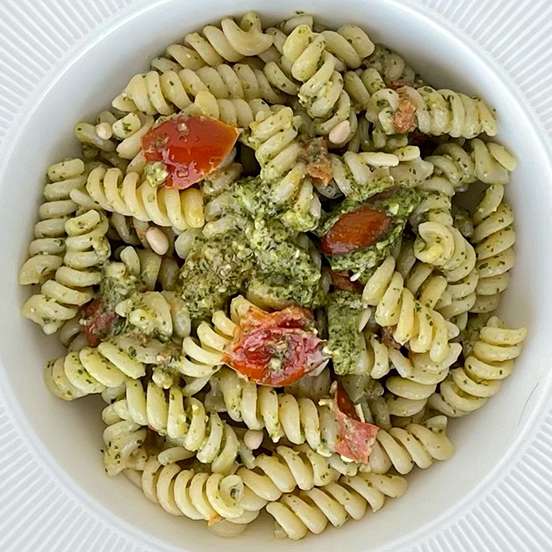 Mescolare bene con il pesto e impiattare aggiungendo qualche pinolo intero e, a piacere, un po’ di parmigiano.