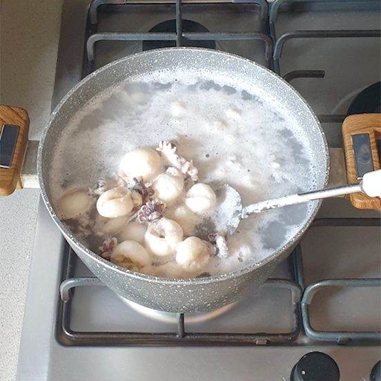 • 1 Dopo aver scongelato le seppie la sera prima, risciacquarle e tuffarle in acqua bollente salata per 4 o 5 minuti dal bollore, poi scolarle e farle intiepidire.