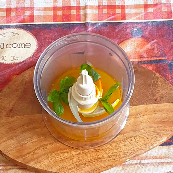 • 2 A questo punto spremere il limone e filtrarne il succo, quindi frullarlo con il basilico, lo zafferano e una presa di sale.