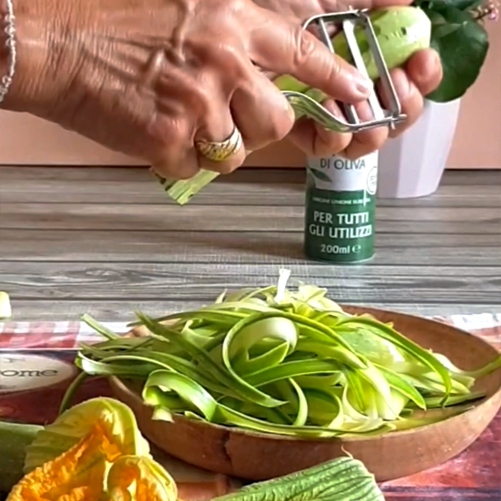 • 4 A questo punto spuntare le zucchine e con il pelapatate o uno spiralizzatore ricavare gli spaghetti di zucchine.
