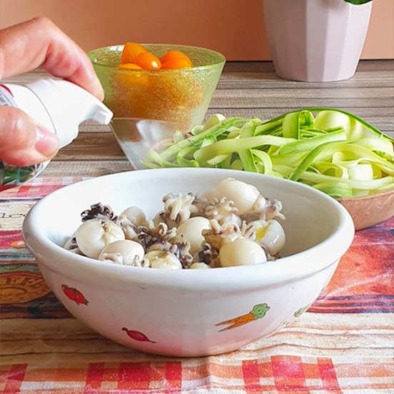 • 3 Poi spruzzare le seppie con abbondante Olio Sagra Classico Spray e lasciare marinare 10 minuti con il condimento al limone mescolando bene.