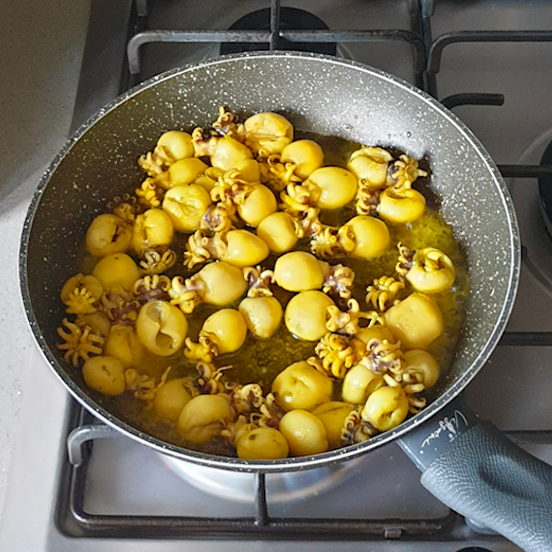 • 6 Nella stessa padella, ripassare le seppioline con il sughetto per pochi secondi per farle insaporire e regolare di sale.