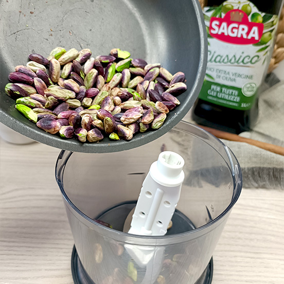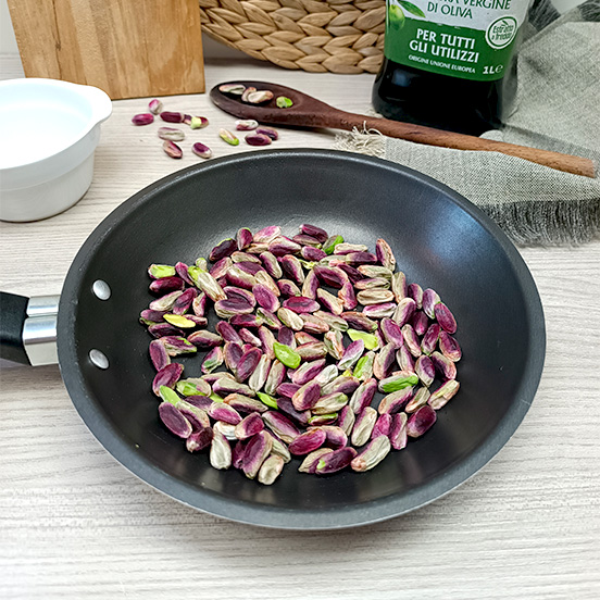 Per cominciare tostare i pistacchi per qualche minuto in un padellino, smuovendoli spesso per non farli bruciare.