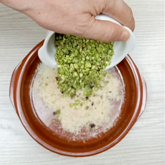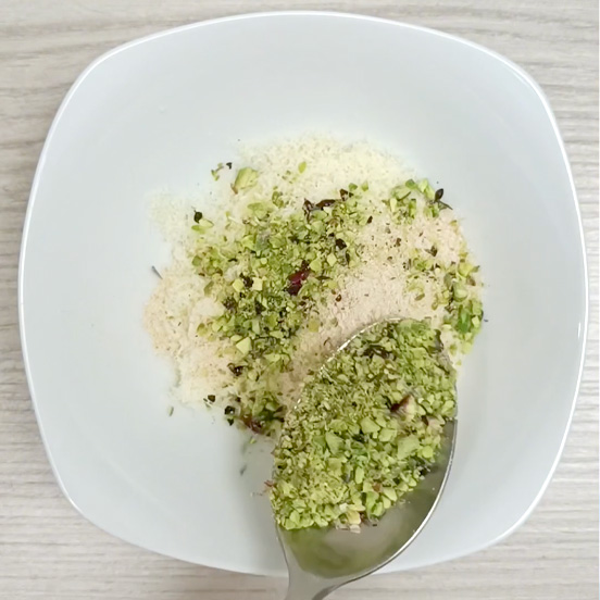A questo punto mettere in un piatto il pangrattato misto a grana grattugiato e il trito di pistacchi più fini.