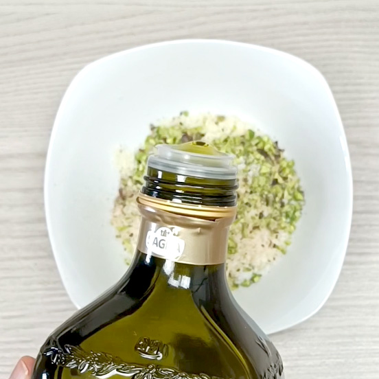 Per creare la panatura esterna degli involtini, mettere in un piatto il pangrattato, il formaggio e la granella di pistacchio più grossolana.