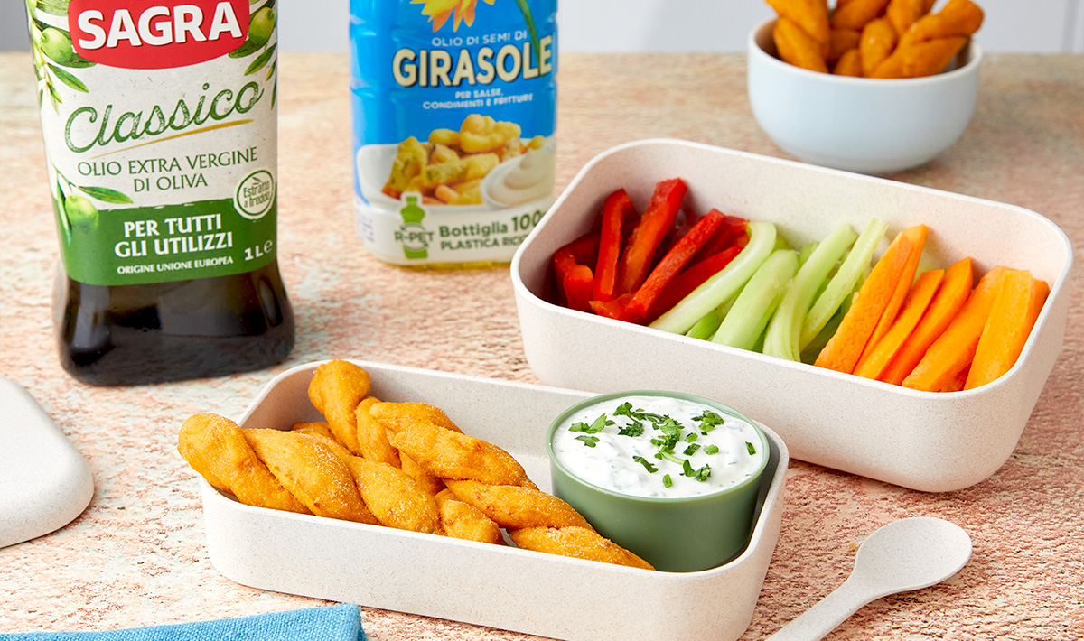 Lunchbox con mousse allo yogurt e erbe, treccine ai pomodori secchi e stick di verdure