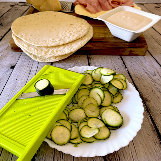 Dopo aver preparato tutti gli ingredienti, lavare e affettare la zucchina a rondelle sottili, con l'aiuto di una mandolina.