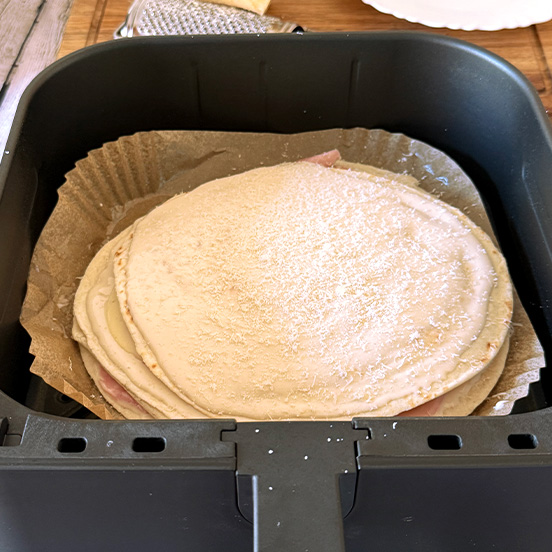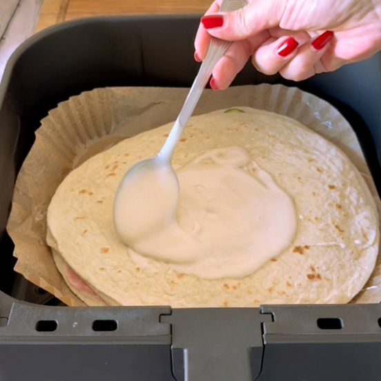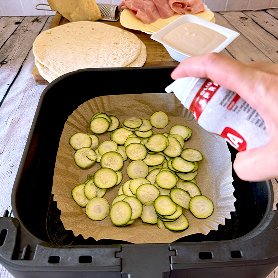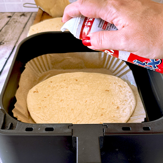 Poi adagiare una piadina nella friggitrice su carta forno e spruzzare su carta e piadina l'Olio di semi Frìmax Spray Sagra.