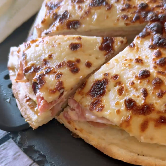 Procedere spalmando sulla piadina uno strato di besciamella e aggiungere uno strato di prosciutto cotto e uno di mozzarella a fette.