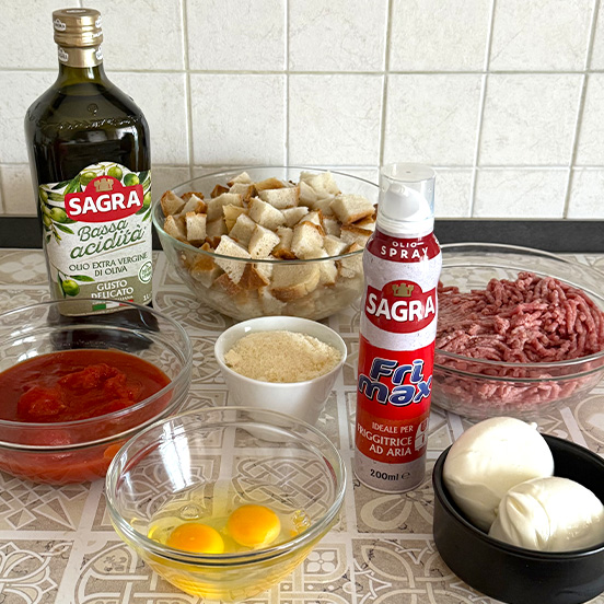 Cuocere in forno ventilato a 180°C per circa 20 minuti. Infine aggiungere la mozzarella a dadini e cuocere per altri 5 minuti con funzione grill.