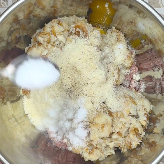 Poi aggiungere la carne macinata, le uova, il formaggio e un pizzico di sale e mescolare in planetaria o a mano.