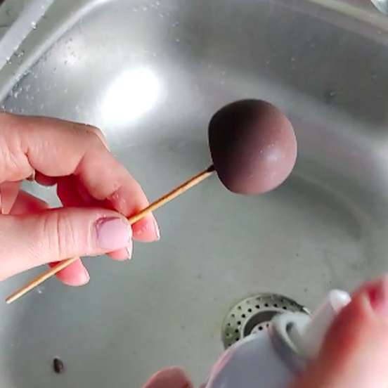 • 9 A questo punto versare la namelaka con una sac à poche dentro uno stampo a sfera da 22 mm di diametro e congelare. Sformare la sfera di namelaka, infilzarla con uno stuzzichino di legno e immergerla nella glassa fondente.