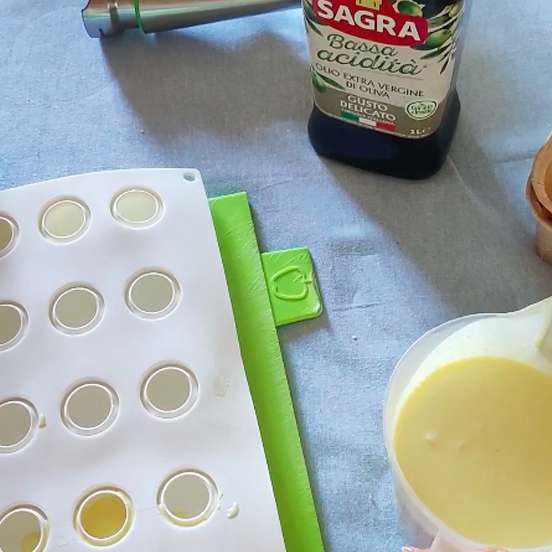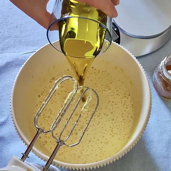 • 2 Montare il composto con una frusta e unire a filo l'acqua, il succo di limone e 85 gr di olio continuando a montare.