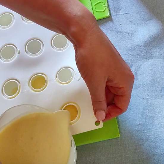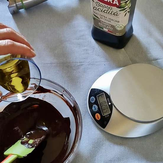 • 6 Nel mentre preparare la glassa fondente. Sciogliere il cioccolato in microonde, aggiungere 100 gr d'olio e mescolare. Utilizzarla a 25 gradi.