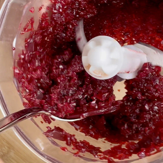 Per cominciare tritare la barbabietola con il frullatore oppure grattugiarla finemente, poi tritare anche la cipolla.