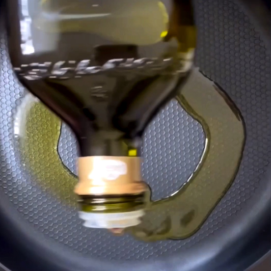 Quindi accendere il fuoco moderato, poi versare l'Olio Extravergine Classico Sagra e la cipolla nella padella e soffriggere.