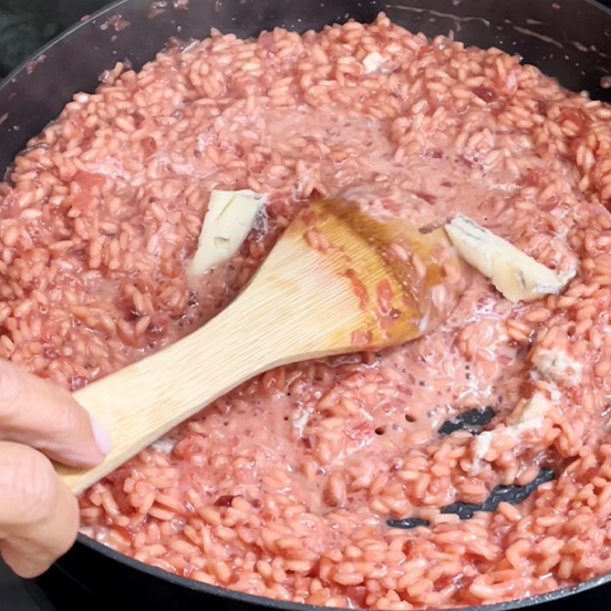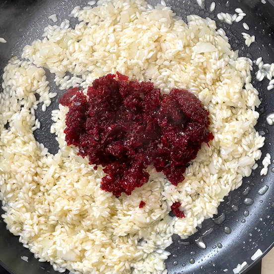 Aggiungere ora la barbabietola tritata e cuocere come di consueto aggiungendo un mestolo di brodo caldo man mano che il riso lo ha assorbito.