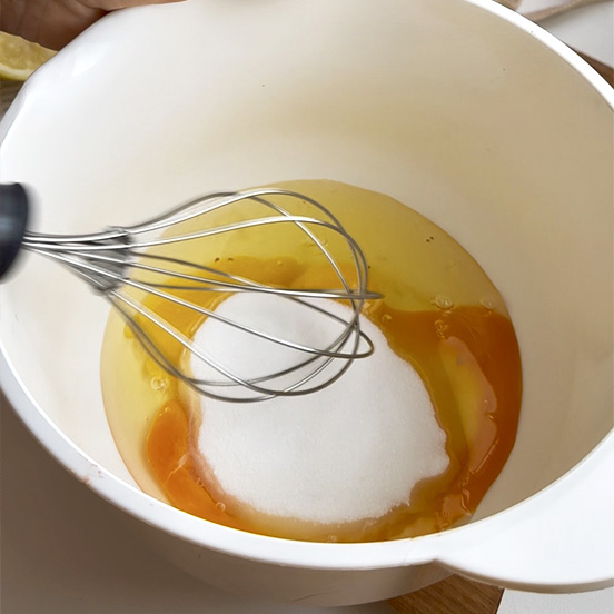 Cominciare mescolando, con una forchetta o una frusta a mano, le uova con lo zucchero finché divengono chiare e spumose.