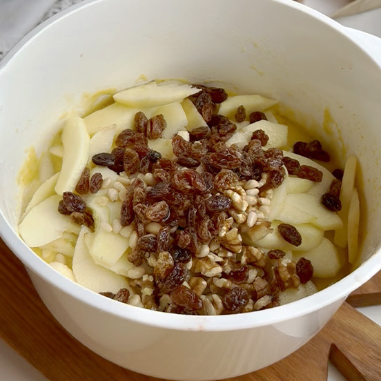 Poi aggiungere le mele, la frutta secca e l’uvetta strizzata. Quindi mescolare bene e versare nello stampo oliato e infarinato.