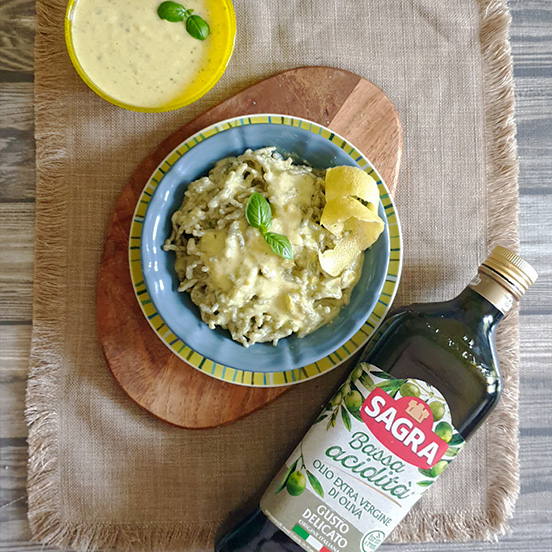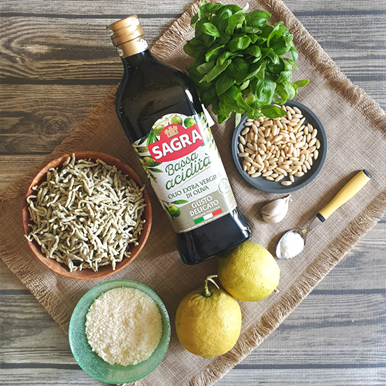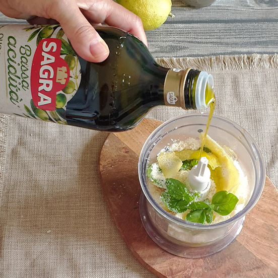 Quindi inserire in un mixer le bucce e il succo dei limoni, il basilico, i pinoli, il parmigiano, il sale, l'aglio e 50 ml di Olio Extra Vergine di oliva Bassa acidità Sagra.
