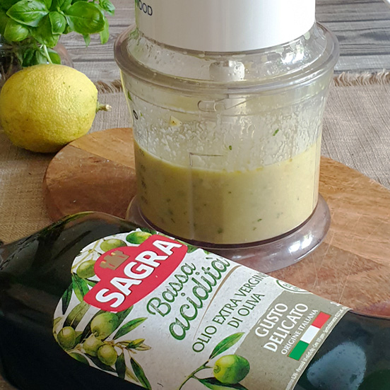 Poi frullare il tutto e aggiungere mano a mano la quantità restante di Olio Extra Vergine di oliva Bassa acidità Sagra fino ad ottenere la consistenza desiderata.